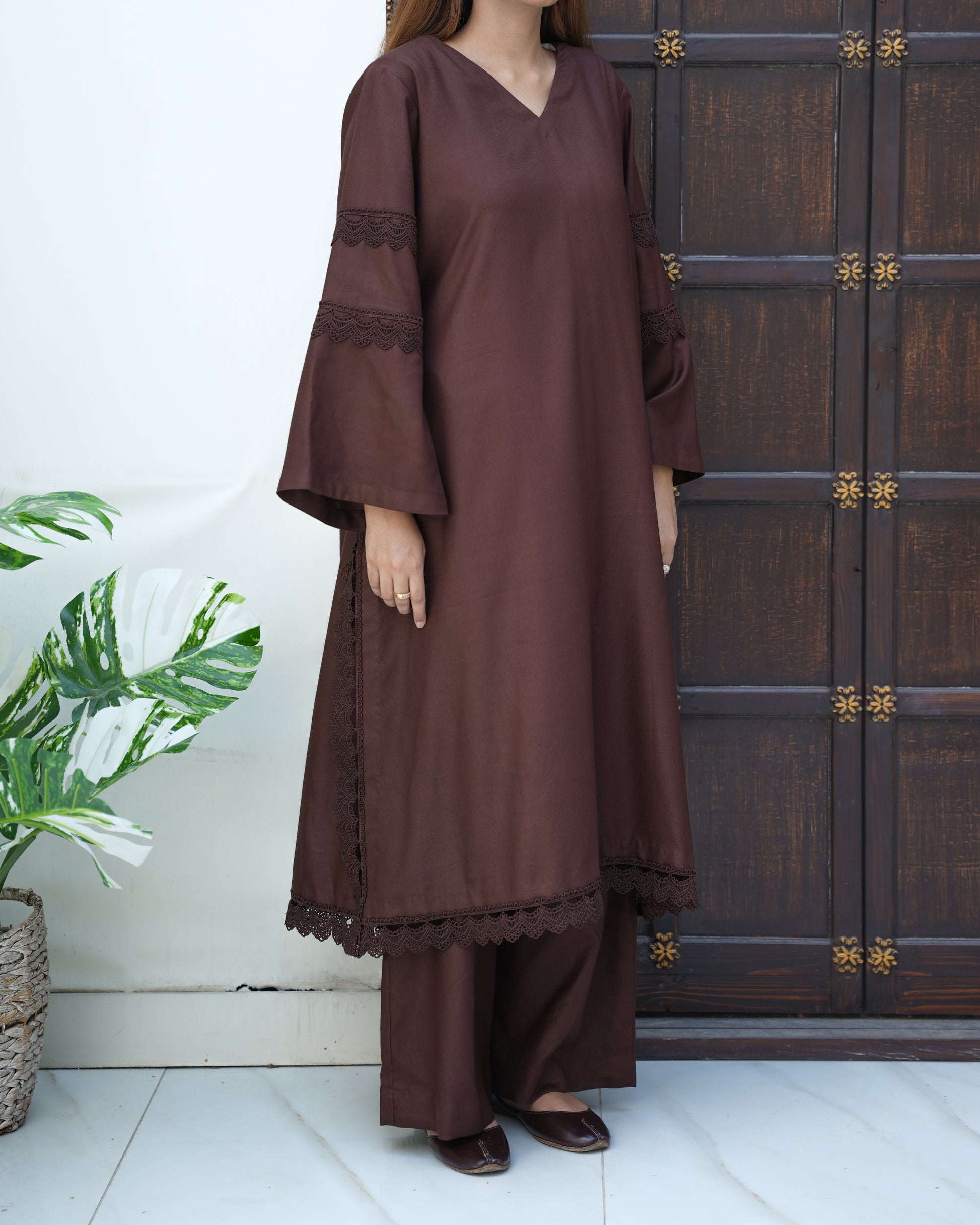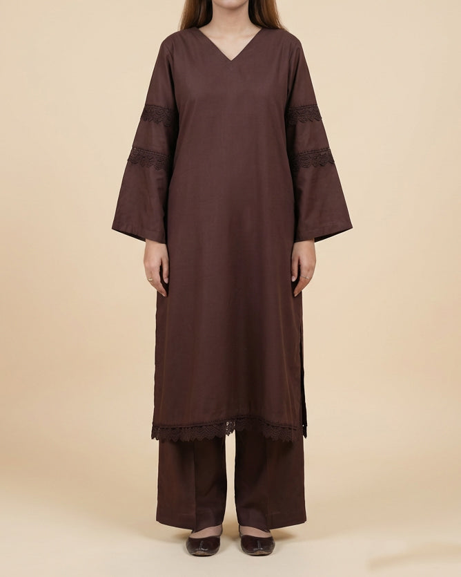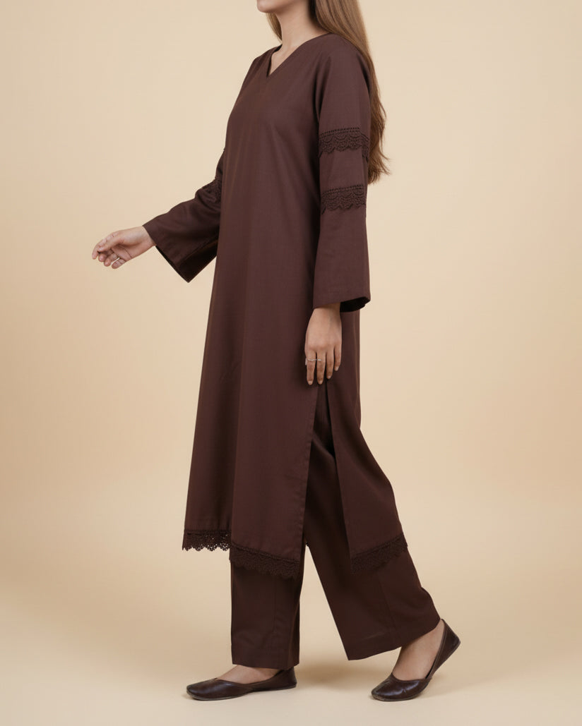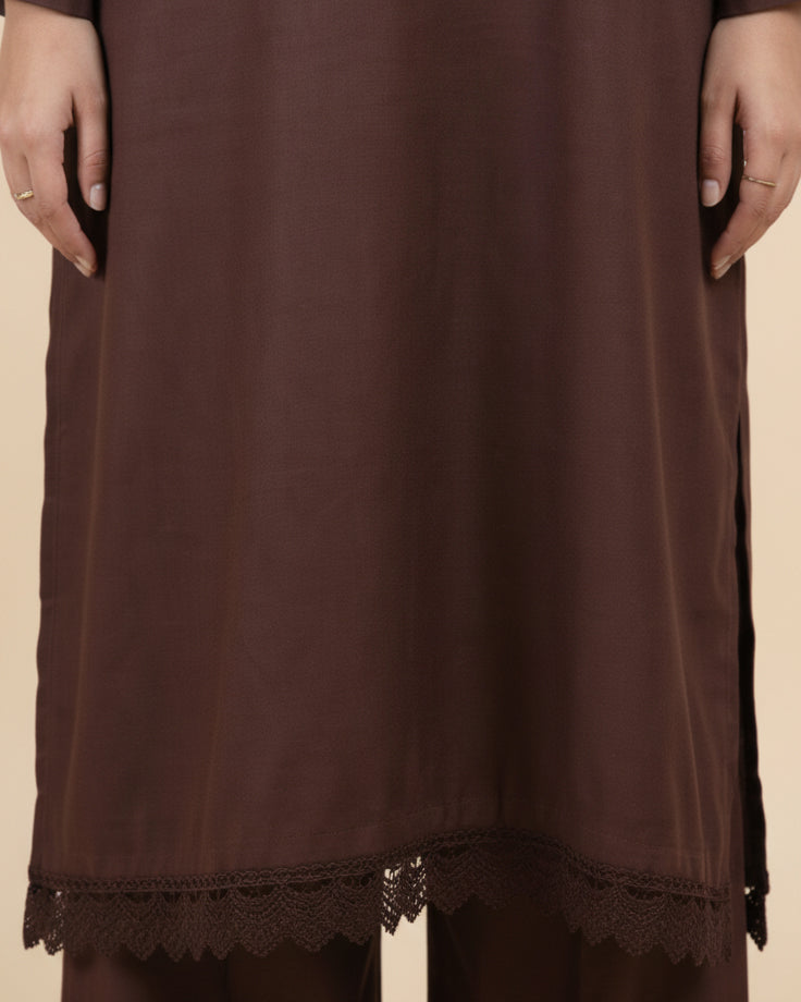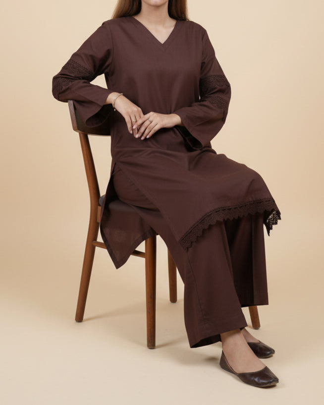 A beautifully understated chocolate-brown lose fit kurta set designed for everyday comfort with a refined touch. Featuring delicate lace trims on the sleeves and hem, this outfit blends simplicity with graceful detailing. The relaxed straight fit and matching wide-leg trousers create an effortlessly elegant silhouette perfect for casual wear, work, or small gatherings.