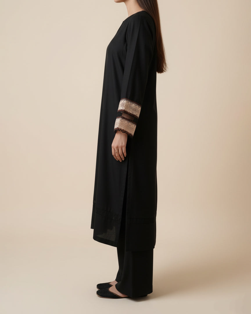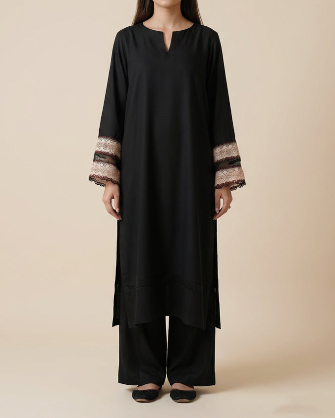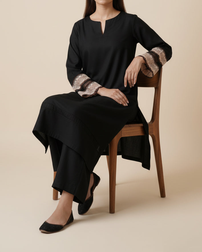 A timeless black lose fit kurta set crafted for effortless elegance. Designed with delicate embroidered lace sleeves, this outfit blends classic simplicity with refined detail. The relaxed straight fit paired with wide-leg trousers ensures comfort and graceful movement for everyday wear or special gatherings. Soft fabric, minimal design, and premium finishing make it an essential wardrobe staple.